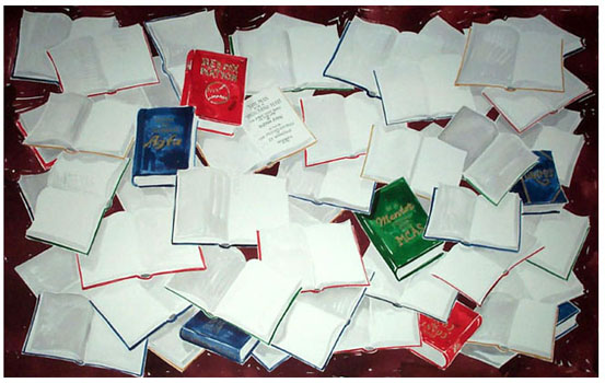 This sign-in board was designed for an avid reader in honor of his 60th birthday. Family and friends recorded their favorite story about him upon the open pages. Titles seen on the closed books in the composition refer to his long professional career and some of his hobbies and passions. |