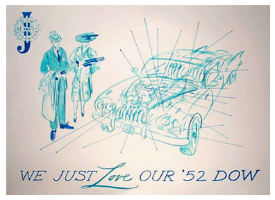 This birthday sign-in board incorporated the profession of the birthday boy (a high-performance auto mechanic). I drew a plausable advertisment for a "1952 Dow" (which incorporated the birth-year and last name of the man). His friends (most of whom were in the same profession) translated his "human" characteristics into automotive ones. |