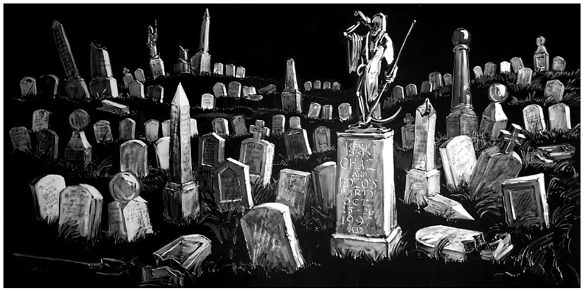 Holiday parties, too, can have specific sign-in boards designed to record the thoughts and opinions of your guests. Here's one designed for hallowe'en. Guests incribed the tombstones with their "costumed" personae. The large central tombstone had the event's title and date inscribed upon it.