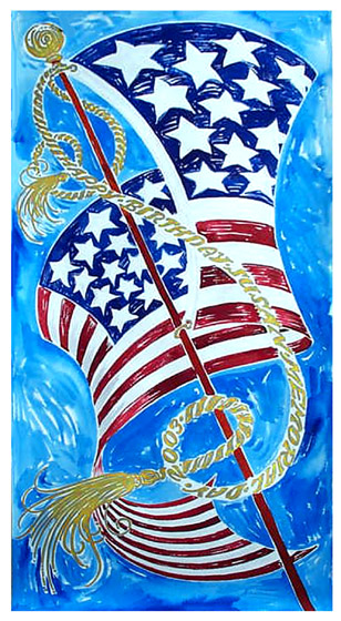 The birthday-girl's name and date are written in the gold braid of the rope. Guests were to inscribe birthday wishes on the stars and stripes of the flag. Consider having a sign-in board designed for your New Year's Eve party, family reunion or your annual summertime BBQ. |