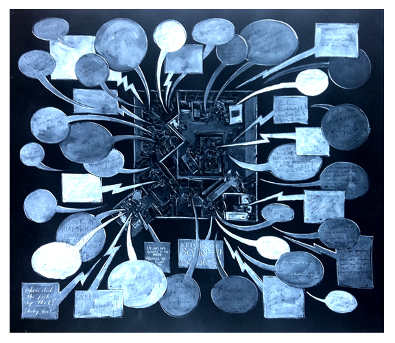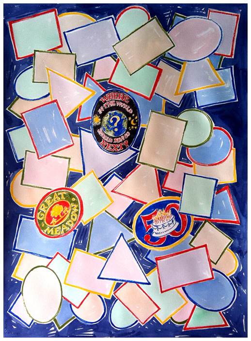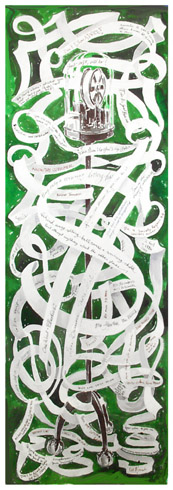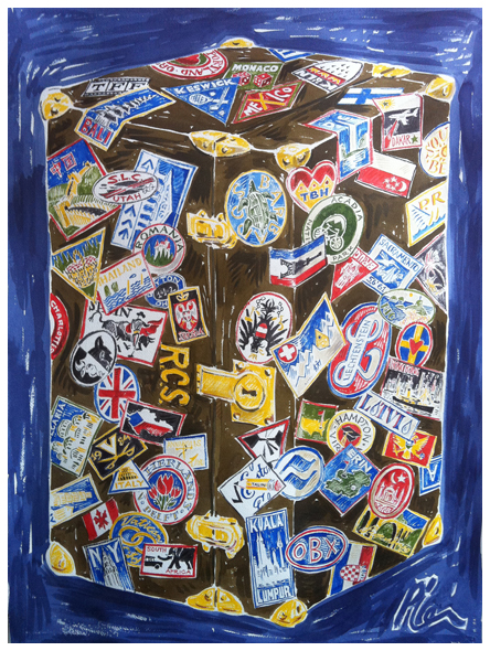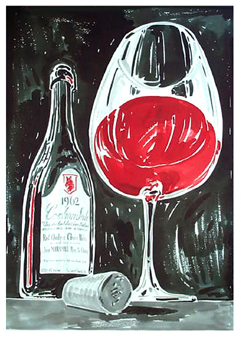 This piece was designed for a swanky wine-tasting event, (the location, date and other such details are inscribed on the label) Guests were asked to describe themselves in oenologist's terms writing uopn the large glass in the foreground. Had you been invited, how might you describe yourself? "A luscious red with hearty bouquet" or a "cheap domestic white wine gone bad"?