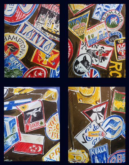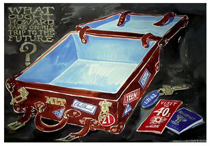 | Significant birthday parties deserve to be comemorated. Turning 40 seems to be a big event. Here's a board which shows a well-traveled suitcase covered in labels from past: milestones such as "childhood", "puberty" and turning "21". Guests were to inscribe within the suitcase those items he'll need for the future as he travels down the road of life...a supply of Viagra, perhaps. |